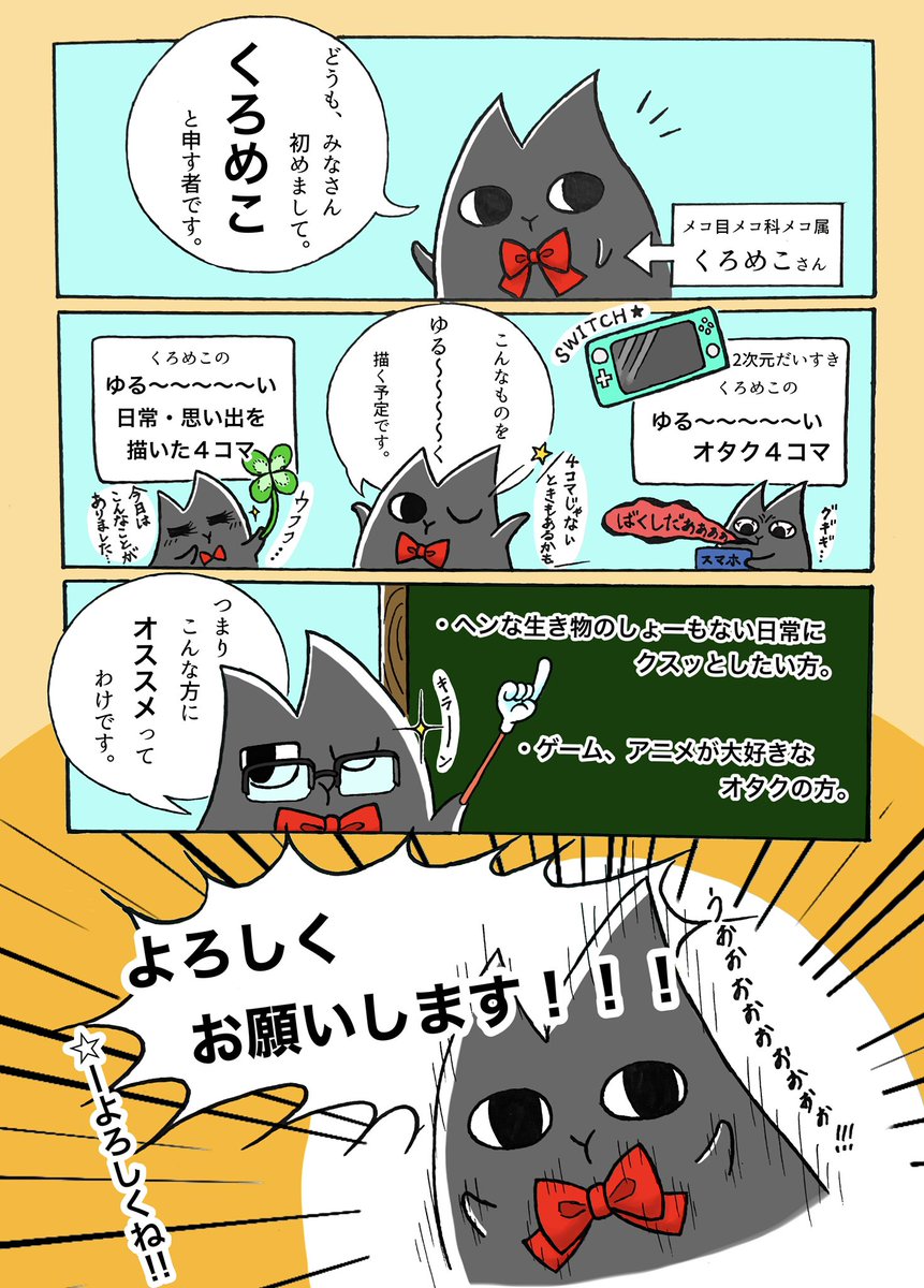 【カラー版🎨】 くろめこさんの自己紹介✨ コツコツ&まったりをモットーに漫画・イラストを描いていこうと思います!(*´꒳`*) #くろめこさん #イラスト #ゆるいイラスト #4コマ漫画 #漫画が読めるハッシュタグ #イラスト好きさんと繋がりたい