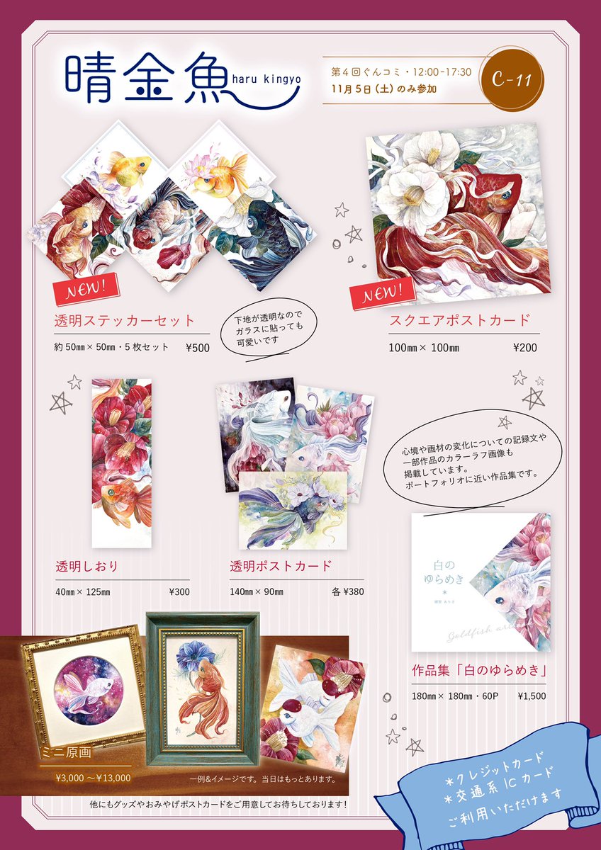 第4回 #ぐんコミ スペース:C-11 参加:11/5(土)のみ ジャンル:一次創作 透明系のグッズ、大変人気です✨ 花を纏う金魚たちをよろしくお願い致します。 🌸詳細はこちら gunmacc.wixsite.com/guncom/schedul… #ぐんコミ_サークル参加