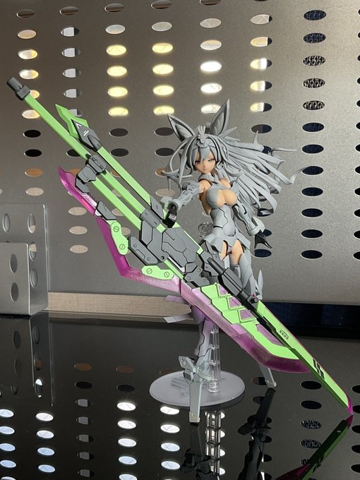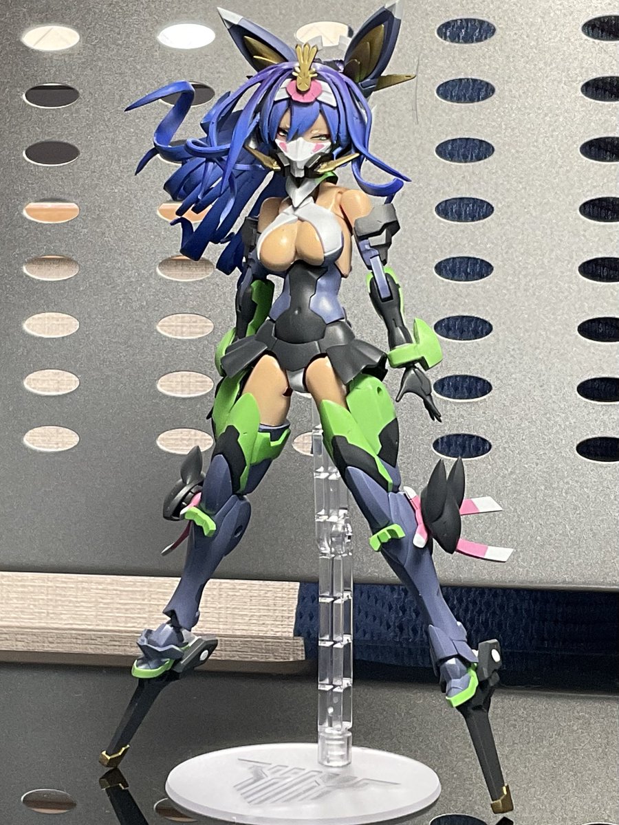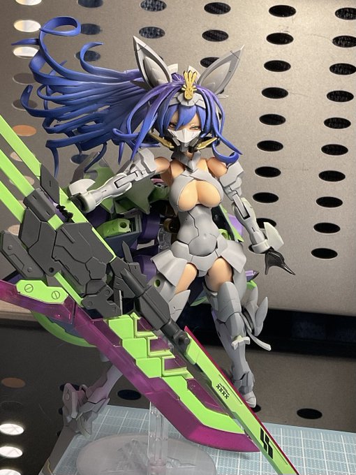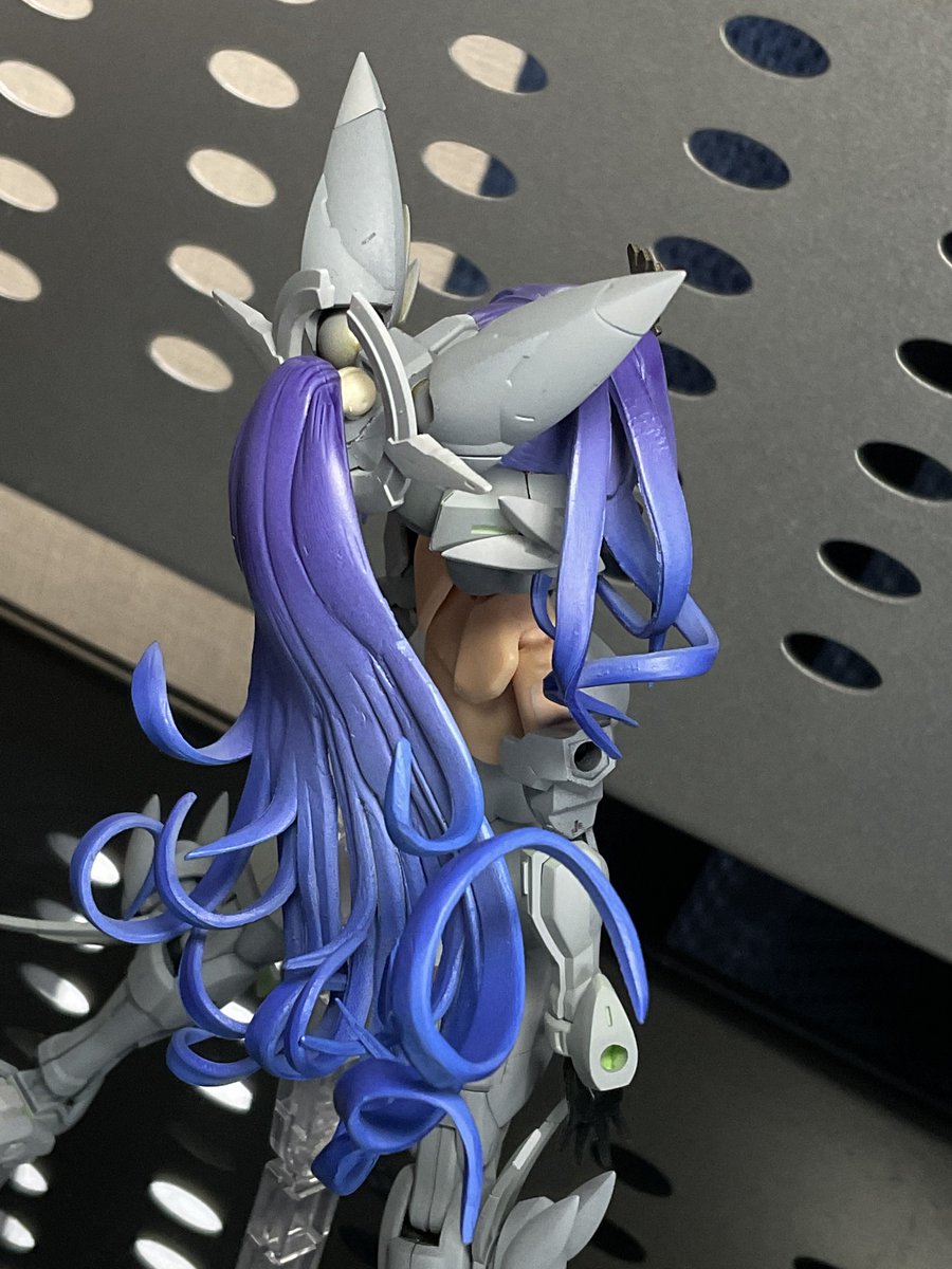 #けせらせらモデリング 考えながら少しづつ塗ってるんで、効率もクソもあったもんじゃないけど、今回最大のポイントである髪色が入りましたよ 思いつきで玉藻マスクも塗り分けてみたけどカッコいいんでないかこれ?