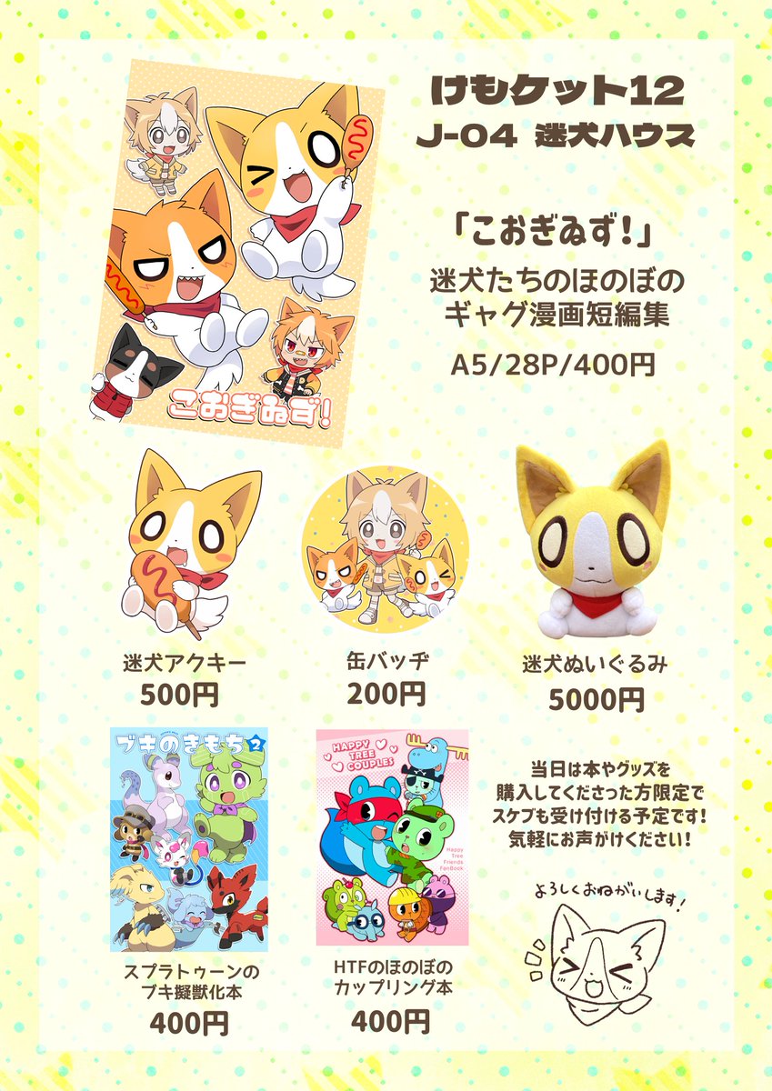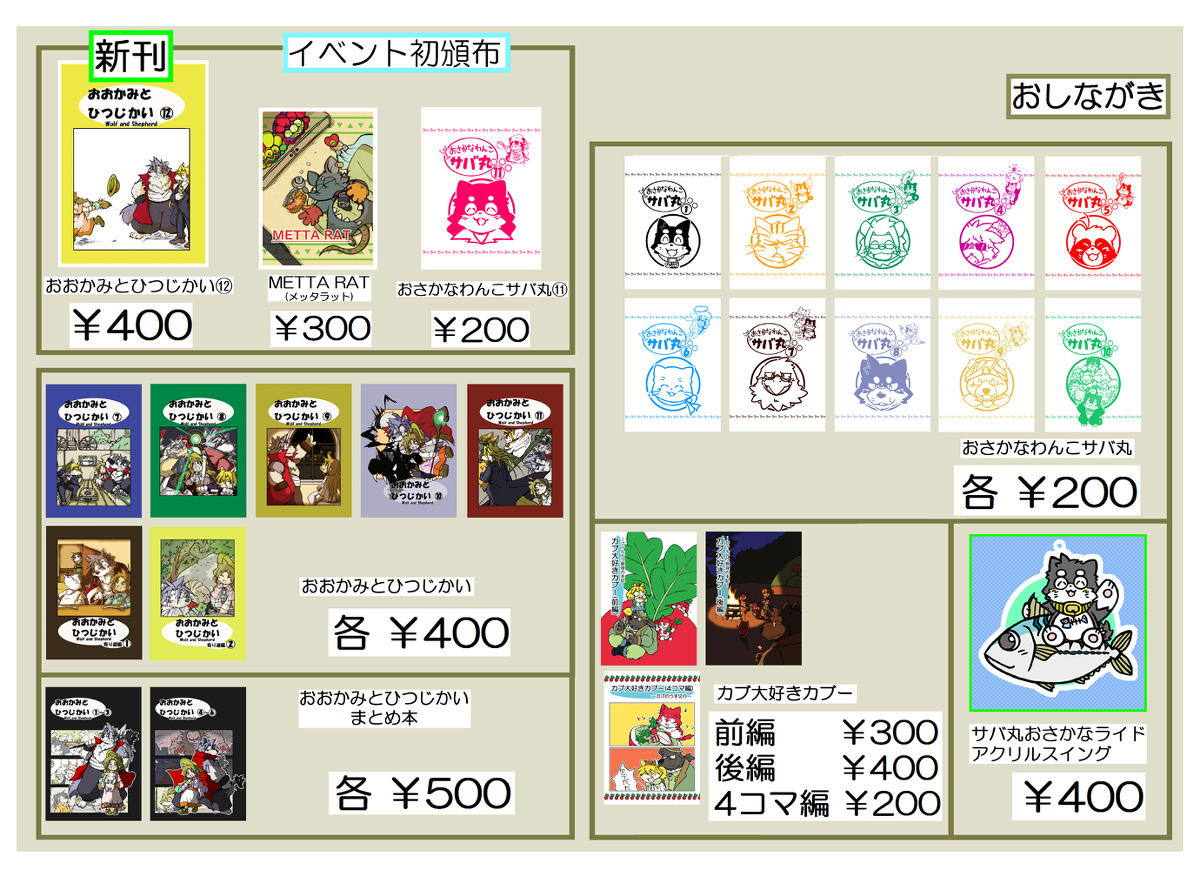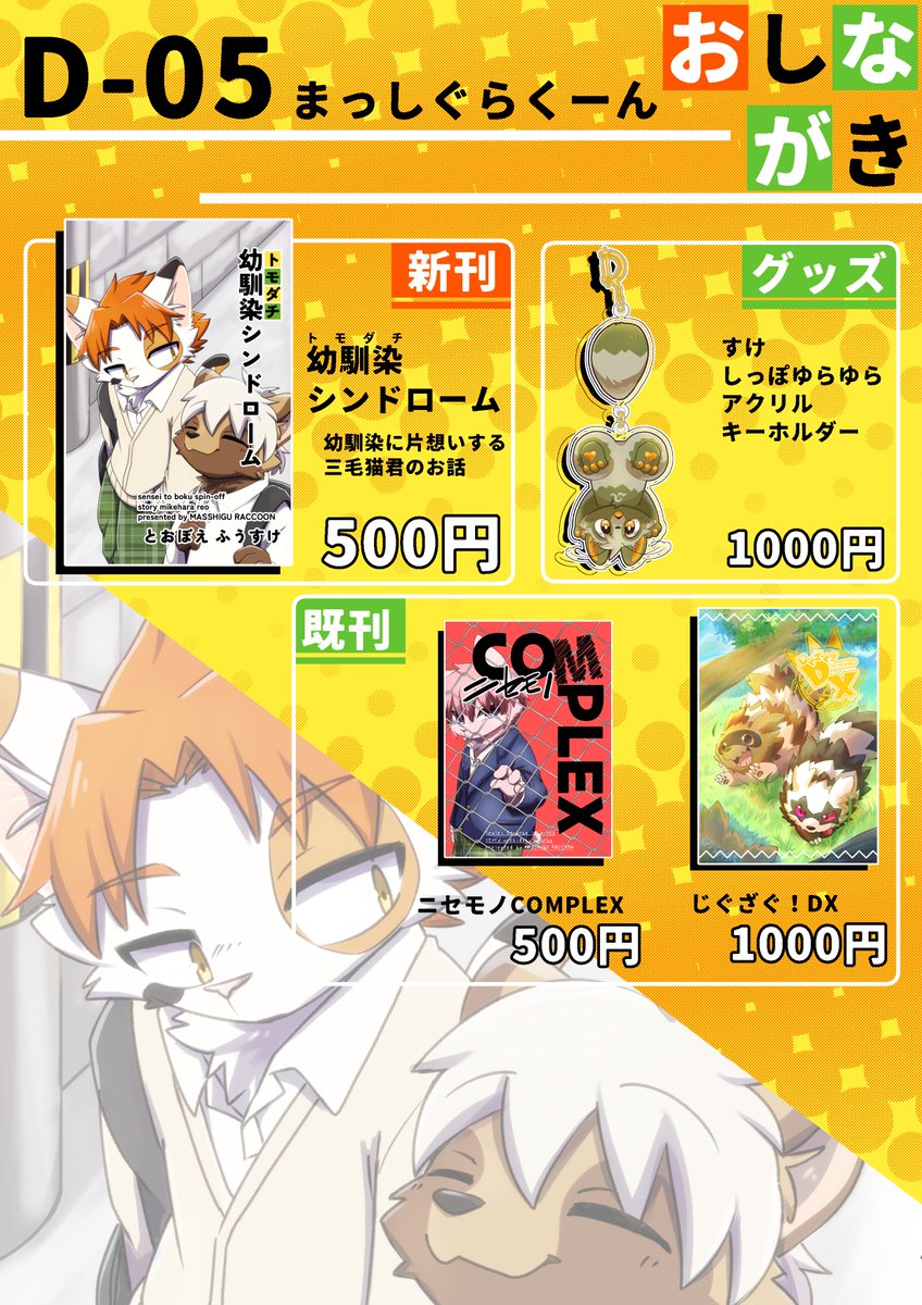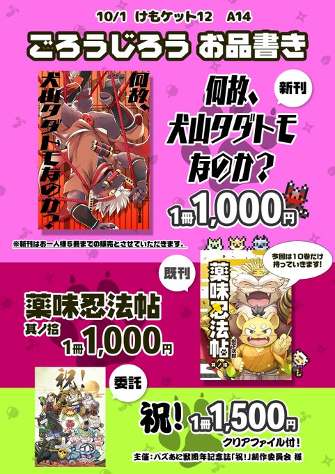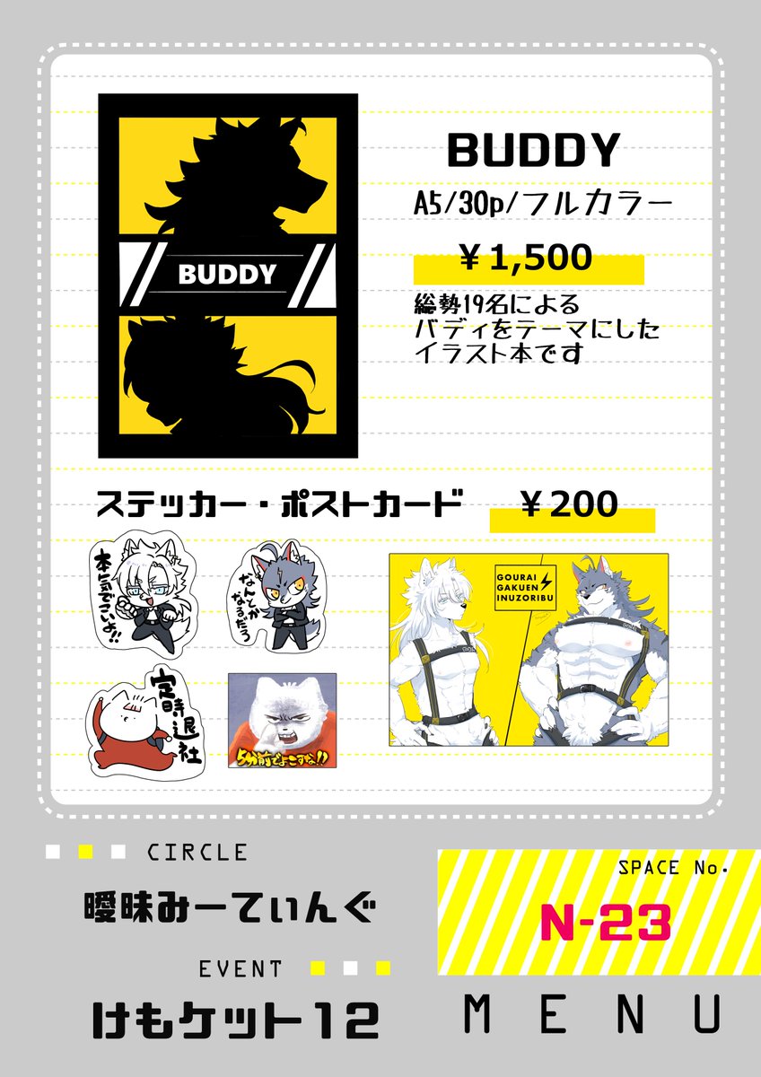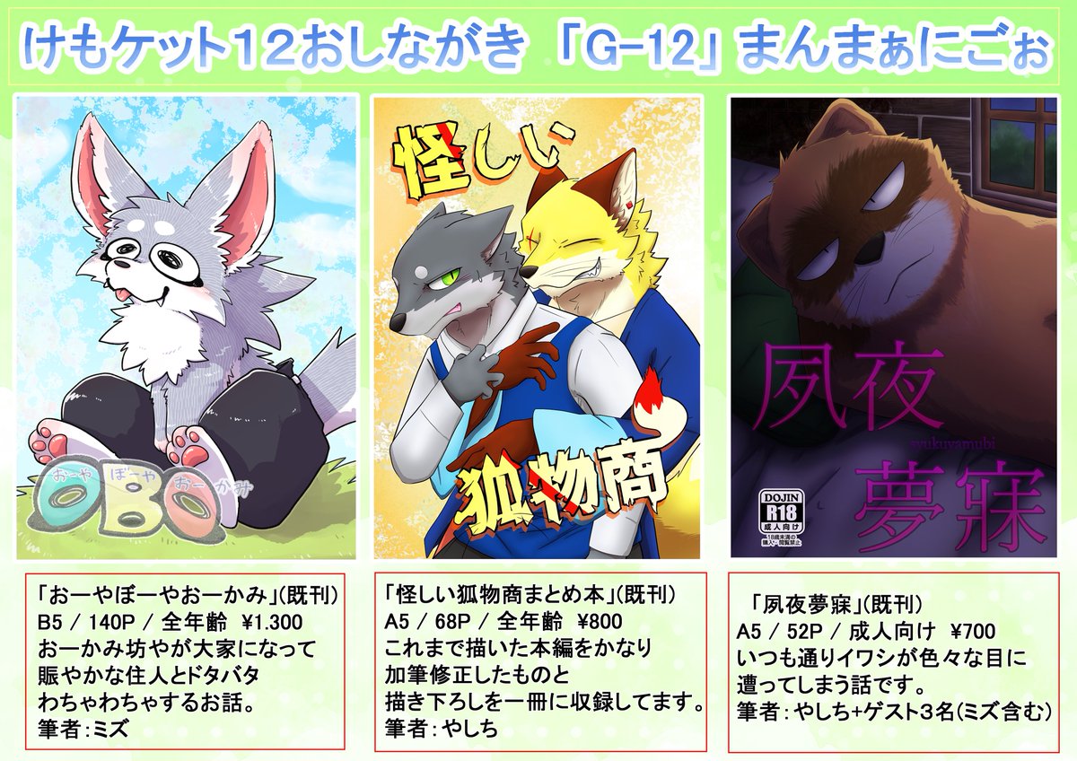 #けもケット12 【N-02:スチールワークス】のお品書きです📝 新刊と干支ケモ男子のポスカと既刊持っていきますよろしくね!また今回、向葵さん(@ v_Apii)の作品も委託頒布するのでそちらもよろしくお願いします🐾 twitter.com/v_Apii/status/…