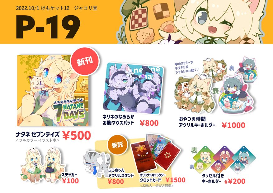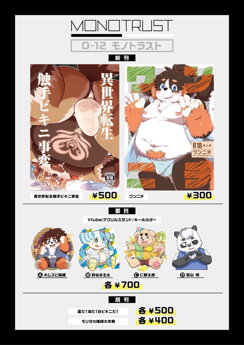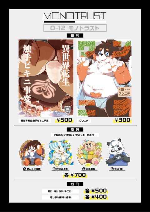 #けもケット12 のお品書きです! O-12モノトラストです!よろしく! ぱるま新刊 twitter.com/dosanco15/stat… ツルギ新刊 twitter.com/tsurugi23/stat… 委託VTUBERアクスタ twitter.com/Omusubi_Inaho/…