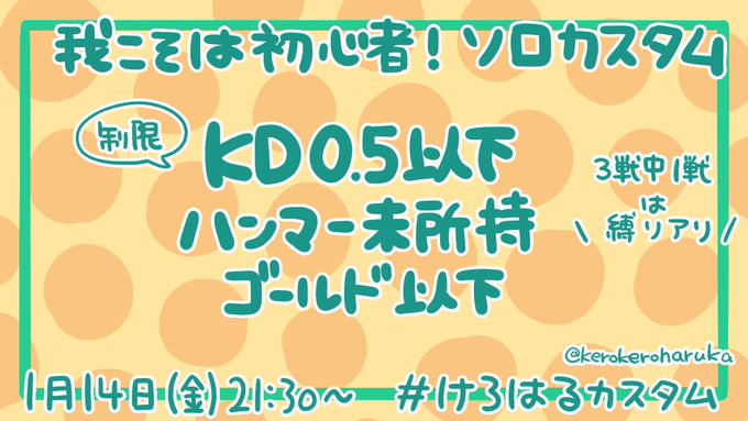 本日21:30~「#けろはるカスタム」 我こそは初心者!ソロカスタムです! 参加者はできるだけ配信を取るようにお願いしてますので、ソロカスタムの恐怖感や縛りの発表後の反応なども楽しめるのかな…と思います! 是非初心に戻って応援してくださいね!✨ 本部配信 youtube.com/channel/UClaze…