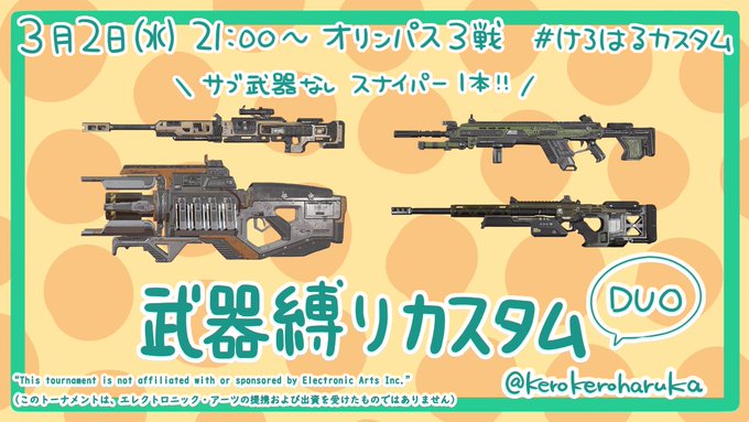 次回の【#けろはるカスタム】は! 武器縛りカスタム(スナイパー1本) 3/2(水)21:00~22:30 オリンパス3戦 デュオ20チーム募集(先着) 残り5チームほど募集です! ※YouTubeチャンネル内コミュニティで先行告知済 ↓詳細はチャンネル内コミュニティから! youtube.com/channel/UClaze… #花天月地