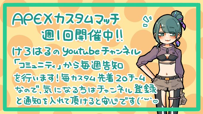 【拡散希望】 毎週APEXのカスタムマッチを開催中! 当チャンネル内のコミュニティで毎週先行告知を行っています! 先着なので、興味のある方はチャンネル登録+通知オンにして頂けると安心です🙇✨ ※Twitter告知は数日後 参加待ってます🥰 #けろはるカスタム ↓チャンネル youtube.com/channel/UClaze…