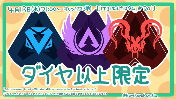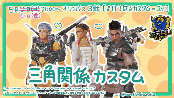 次回の【#けろはるカスタム】は三角関係カスタム! ※ヴァルキリー・ローバ・バンガロール限定 5/6(金)21:00~ オリンパス3戦 先行告知はYouTubeの為残り枠8チームです🙇 詳細&エントリーフォームは当チャンネル内「コミュニティ」から確認できます! ↓チャンネル youtube.com/channel/UClaze…