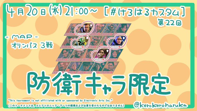来週の【#けろはるカスタム】は防衛キャラ限定カスタム! ※過去最高ランクがプレマス帯の方はチームに1人 先行告知はYouTubeの為残り枠10チーム! 詳細&エントリーフォームは当チャンネル内「コミュニティ」から確認できます! よろしくお願いします🙇♂️✨ ↓チャンネル youtube.com/channel/UClaze…