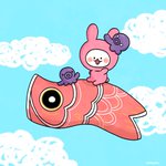 23/5/5 こどもの日、おめでとう✨ こいのぼりに捕まって、ぴゅーん🎏 今日は風が気持ちいいねぇ みんなのところも晴れてるかなぁ☀️ #おもちの日々 #こどもの日 #こいのぼり #イラスト #みんなで楽しむTwitter展覧会 #ゴールデンウィークSNS展覧会2023