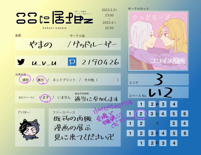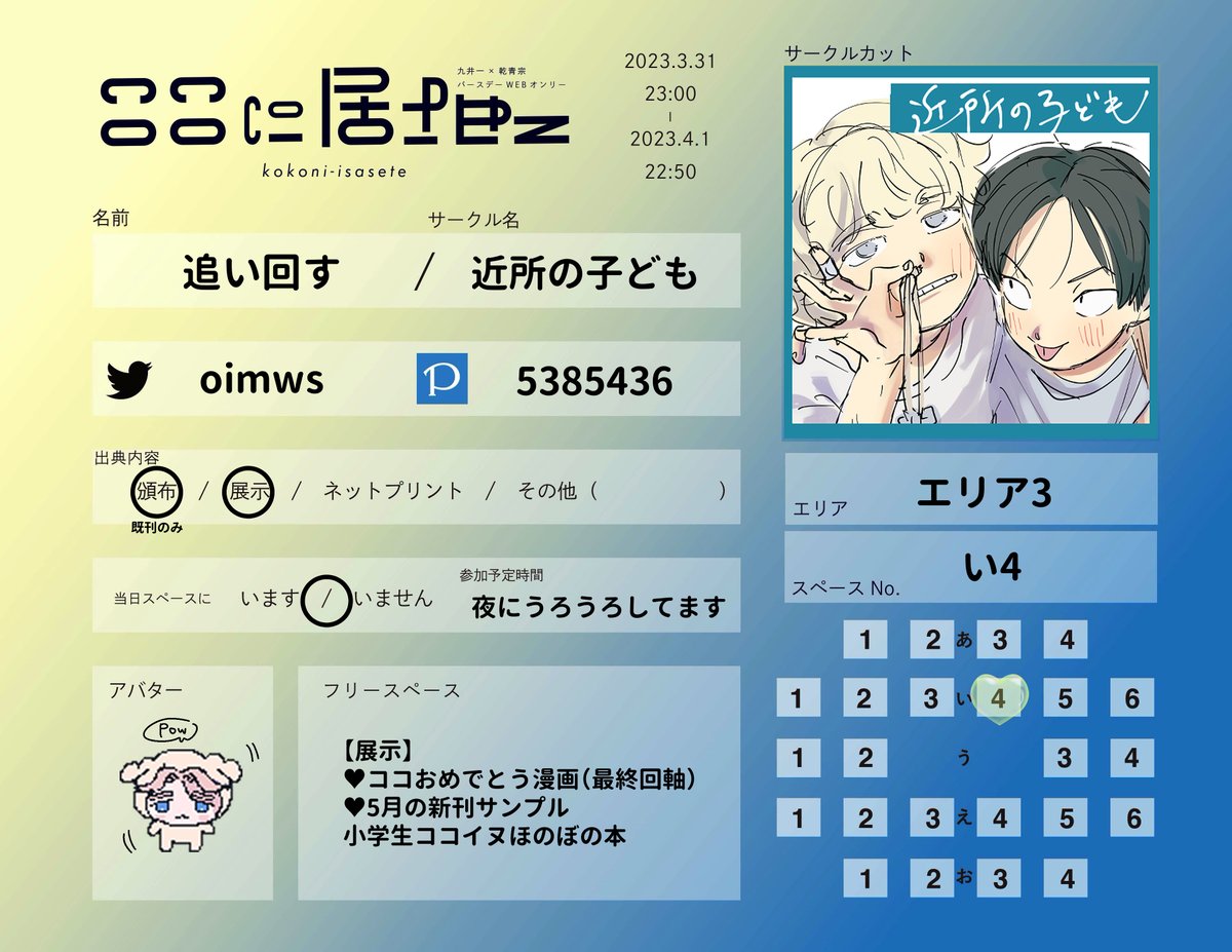 【イベント】ココイヌバースデーwebオンリー「ここに居させて」 参加させて頂きます! 🈁の誕生日にちなんだ漫画を展示予定です。よろしくお願いします。 #ここに居させて0401 pictsquare.net/626s4rm2mg3zoh…