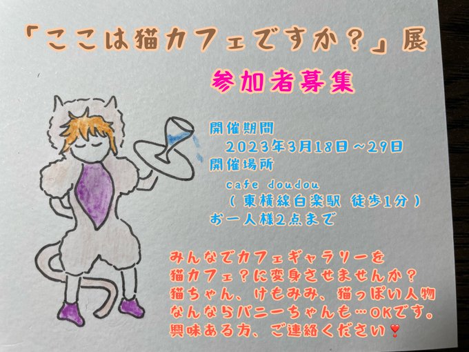 #イラストレーターさんと繋がりたい #イラストレーター募集 #ここ猫カフェ 来年の3月の展示会です。 参加者様の募集を開始させて頂きます。 ガチ猫ちゃん、擬人化猫ちゃんなどなどの作品でギャラリーを埋め尽くしたいです。 ご興味湧きましたら詳細ご説明させて頂きます。 よろしくお願いします。