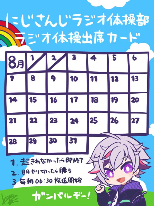 今年も始まる夏の風物詩… "にじさんじラジオ体操部"📻🎶 今年もこのカードをうめていくぞーっ❕ (ベースが昨年のまま𐤔𐤔𐤔) 目指せ無遅刻無欠席✊🏻❤️🔥 カードはご自由にお使い下さい🙆🏻♀️💗 ご使用時の注意点はリプ欄へ⬇️ #にじさんじラジオ体操部 #絵スコート #ことのおえかき帳