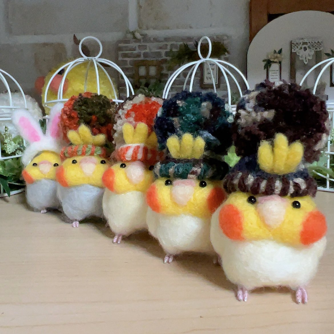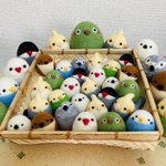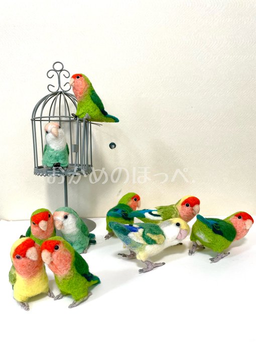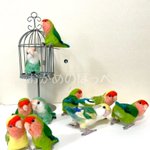 ことりマーケットに委託参加いたします。 コザクラインコを作りましたよ。 チリアガールが4羽、首を傾げるあざといミニインコが2羽、頭にインコのう◯こついてますよヘアクリップが4羽です。 #ことりマーケット大阪