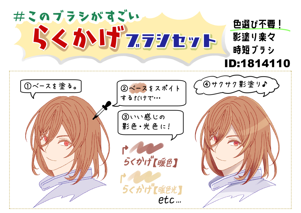 #このブラシがすごい らくかげブラシセット(by舞如さま) assets.clip-studio.com/ja-jp/detail?i… ベース色をスポイトするとなぜか影色になる。魔法か!? らくがきに影をつけたいけど色選びがめんどくさい人間の強い味方。