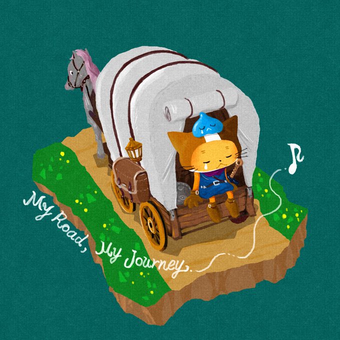 この道 わが旅 果てしなくつづく 出会いと別れを くり返しながら。今夜は冒険の書、久しぶりに開いてみようかな。 #ネコキャット #猫と仕事とゲームと #ドラゴンクエスト #この道わが旅 #すぎやまこういち #dragonquest #グラフィックデザイン #イラスト #illustration