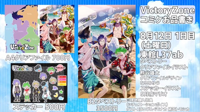 【おしらせ】 メンズ VTuberグループ「Victory Zone」で コミケグッズ(タペストリー&クリアファイル)イラストを描かせていただきました!! アリガッドゥ! 当日はご本人様売り子だそうです、ファンの皆様よろしくお願いします!! #びくぞ #こへあーと #Ryugon_Tale #TaishiArt #ふぁんアート