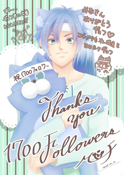 みなさんいつもモフを見てくれてありがとうモフ(●´ω`●)💕 お友達が1700人になったモフよ(∩´∀`)∩わっちょーい♡ お祝いにモフが...ってギョフ君⁉がお祝いにかけつけてくれたモフ これからもたくさんの方々とお話しできたら良いモフ💕 #これからもよろしくお願いします #擬人化 #お祝いイラスト