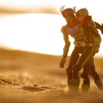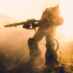 #これを見た人はド逆光の写真を貼れ #既掲でもいいのでとにかくジオラマやビネットを貼ろう #ユニコーンガンダム の重装甲型グフが古城出撃シーンの裏側はこうなっていたと言う妄想 ジオンの旗の元に出撃するグフを見送るジオンの残党兵達 少ない物資の為、メカニックの足場は木材の木組み