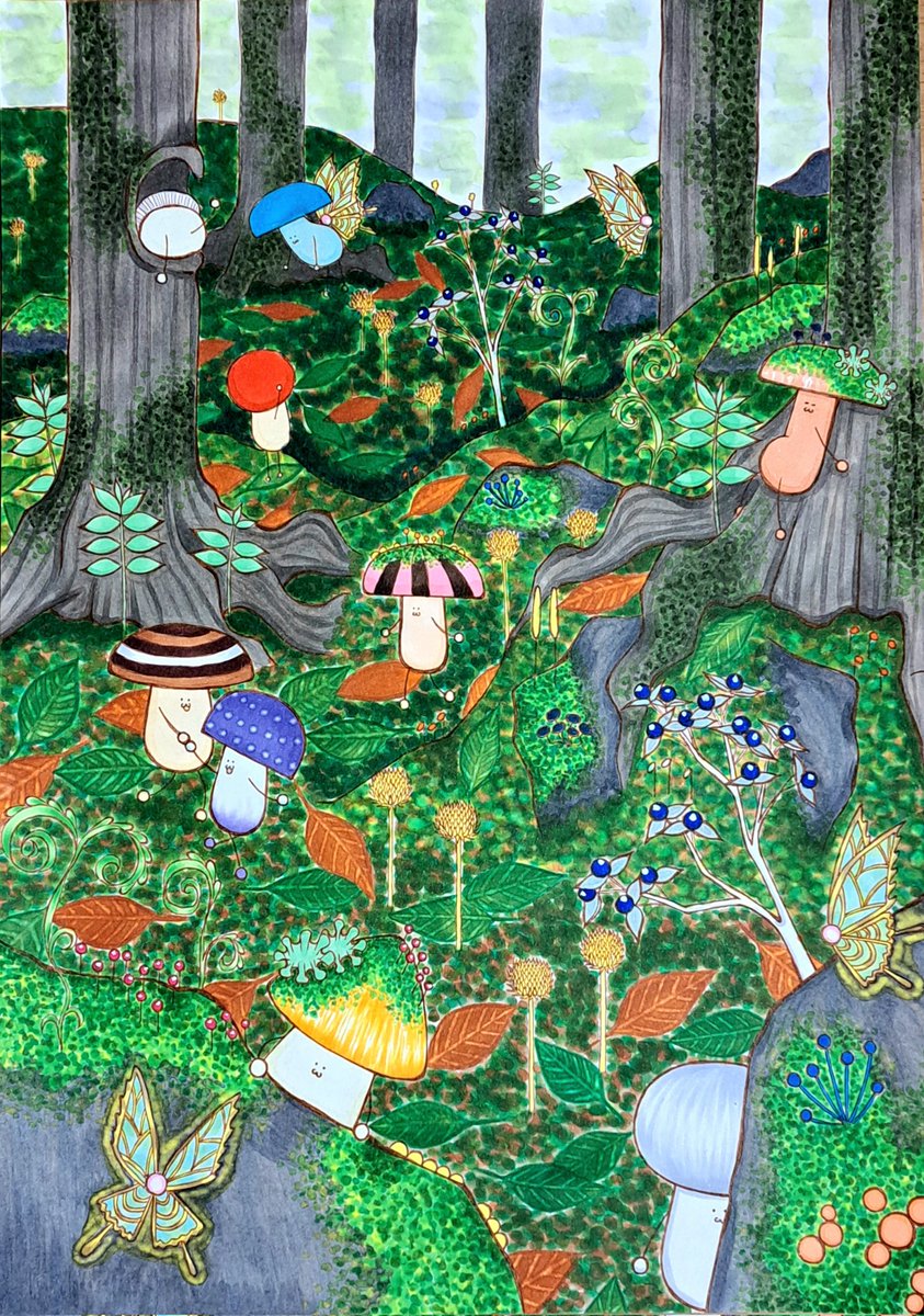 #これ見た人は適当に7文字呟く 『みぽきのの森』 ~ゆかいで 可愛い きのこの妖精~ 今日も森や湖、いろんな場所で遊んで暮らしているみぽきの達です🍄🍀 6月なので、紫陽花みぽきのもいるようです😊💠 #絵柄が好みって人にフォローされたい #初夏の創作クラスタフォロー祭り #きのこ