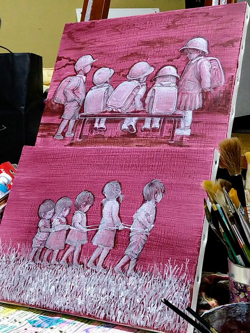 #こんな絵描いてます #アクリル画 もともと絵を描いていて楽しいと思える時間は制作時間全体の2割ぐらいだったけど、絵が仕事になってからは1割ぐらいになった。 仕事し始めて5年目の今、楽しく思える時間が2割5分ぐらいになっている気がする。