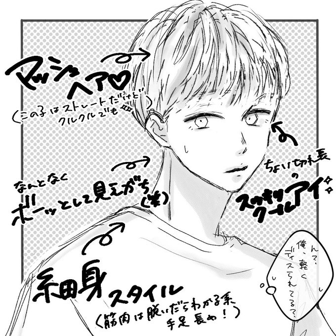 #こんな見た目のキャラが好き(異性) #コルクラボマンガ専科 前髪長めサラサラかフワフワ髪 小顔、身長180cm超え、身体の半分は脚 程よく筋肉質 一重か奥二重でスッキリした目、若干タレ目、逆八の字眉、唇薄め厚め 泣きそうな顔で笑う笑顔が可愛い 色気あり #193int_comic twitter.com/i/web/status/1…