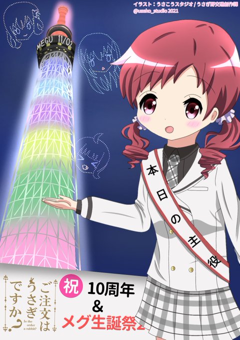 奈津恵 (メグ) さん、お誕生日おめでとうございます🎉 メグちゃんのピュアなところが可愛くて好きです! 彼女の誕生日とごちうさ10周年を記念し、大都会でタワーのライトアップと花火イベントを開催…それが今回のイラストです♪ #奈津恵生誕祭2021 #ごちうさ10周年 #gochiusa