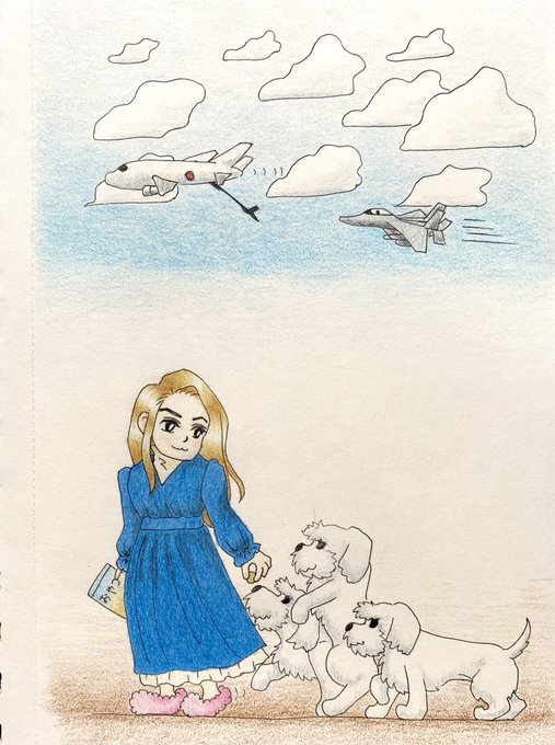 今日のお絵描き。空中給油機✈️カッコイイですね!給油機ごっこで、おやつを補給🥰ミッションは成功するのか?#お絵描き #イラスト #アナログ絵 #drawing #illustration #犬 #dog #シュナウザー #schnauzer #空中給油 #AirRefueling #ごっこ遊び #PretendPlay