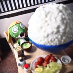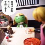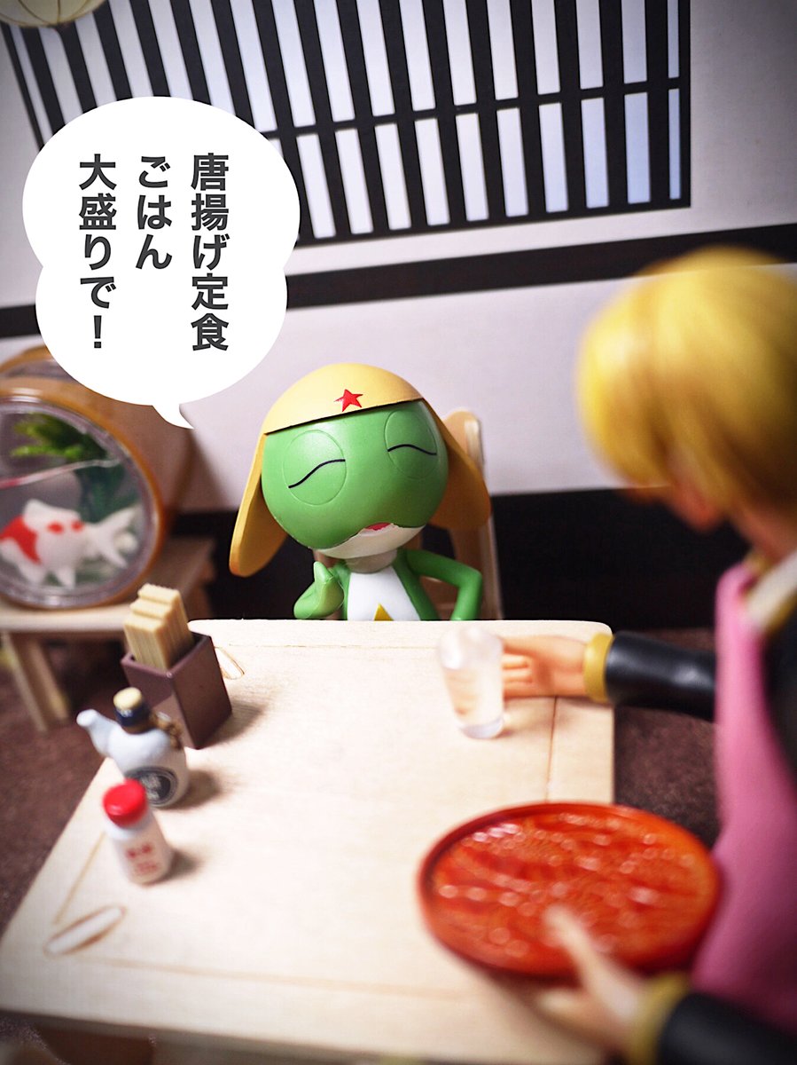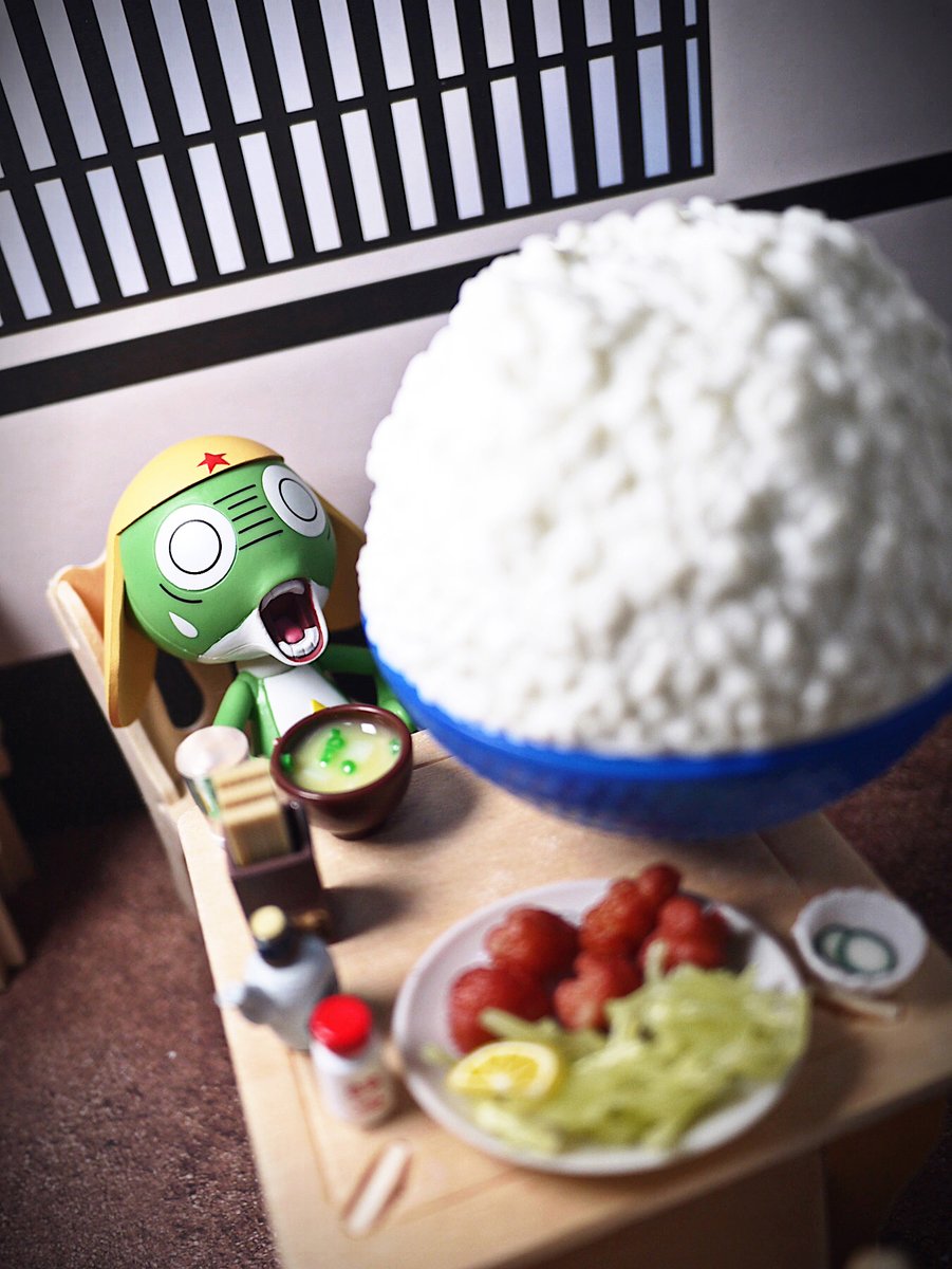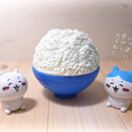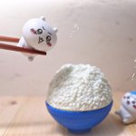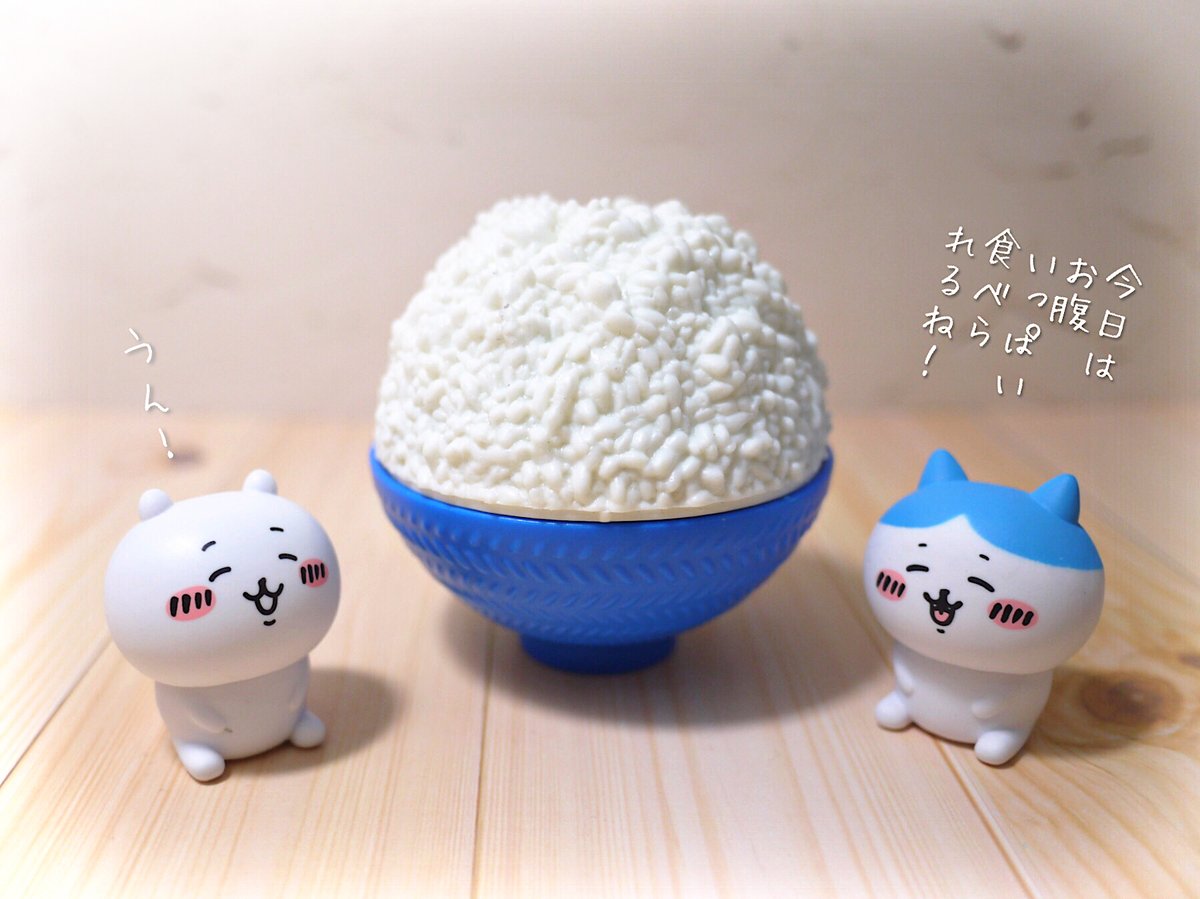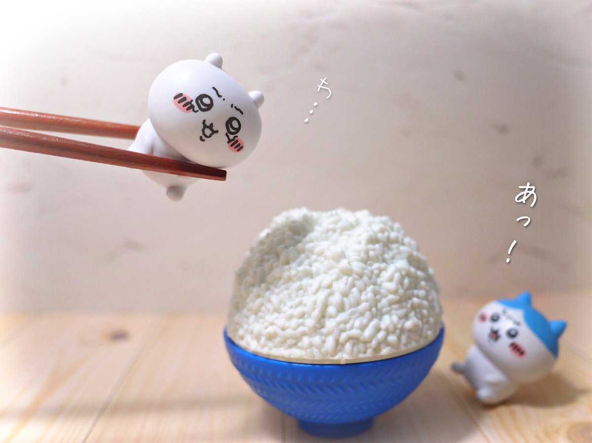 #夜のフィギュア撮影会 5/14 お題 『巨大』 巨大なごはんを見つけて喜んだのもつかの間 巨大な何かに捕食されそうになるちいかわとハチワレ。 #ちいかわ #100均 #ごはんのおともくん #ガチャガチャ #カプセルトイ