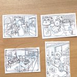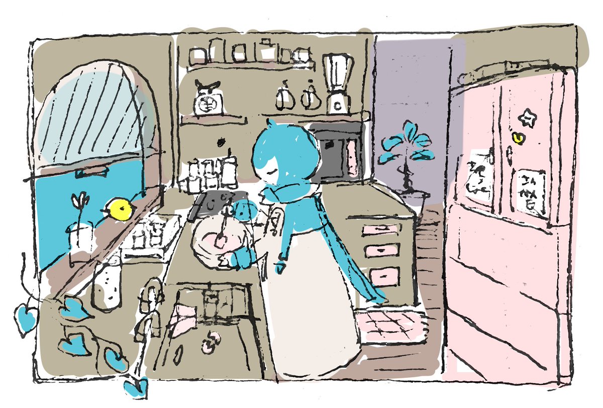 #さいとうなおきのお絵描きドリル1日目 大ラフ4枚とカラーラフ2枚 『大ラフ→少し丁寧なラフ』の過程は端折りました😇 テーマは「優しい雰囲気」を「植物の多いキッチン」で描く、というところだったのですが植物は…????あれ…どこ…??となってしまったのでまた隙間に増やします🪴