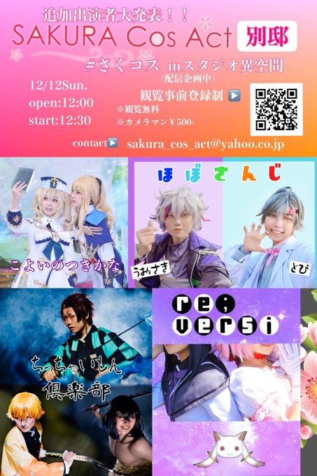 🌸拡散希望🌸追加出演者を大発表!!🌸✨12/12 Sun.✨ SAKURA Cos Act別邸 □入場無料(事前登録制)⬇️ ws.formzu.net/sfgen/S4343497… □配信未確定 □終演後交流有 □会場: #スタジオ異空間 studioikukan.fc2web.com/index.html 名鉄瀬戸線喜多山駅徒歩10分 無料駐車場なし #さくコス #さくコス別邸