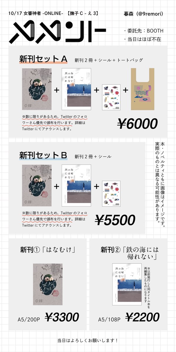 【10/17 さにイベ十三夜新刊①】 「はなむけ」 ※刀さに A5/200P/3300円 〝恋を見守る初期刀〟をテーマに描いた5篇をまとめました。web版に加筆修正+描き下ろし10Pを加えています。 ▶︎サンプル pixiv.net/artworks/93303… ▶︎通販 9remori.booth.pm/items/3334469 #さにイベ十三夜 #さにイベ撫子
