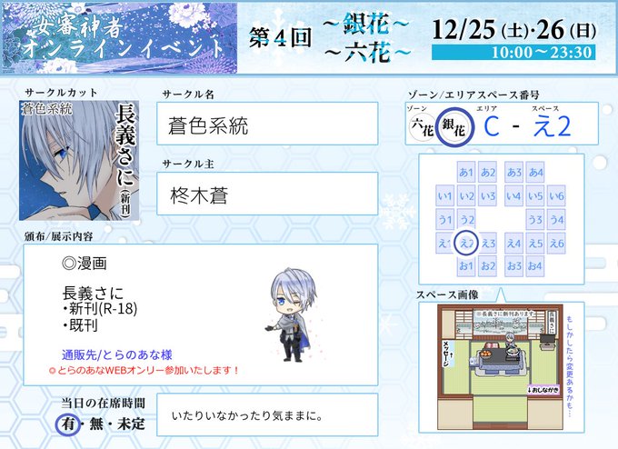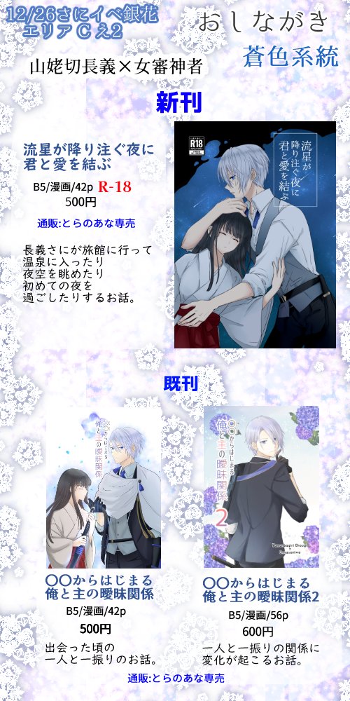 12/26開催の女審神者オンラインイベント-銀花-pictsquare.net/u0wbcbjnjs8agu…に【A-い1/あなや】にて参加します。 11月発行みかさにアンソロ・個人誌・既刊を頒布します。イベント限定web公開あります。 通販:ec.toranoana.jp/joshi_r/ec/cot… お品書:pixiv.net/artworks/94964… #さにイベオンリー #さにイベ銀花