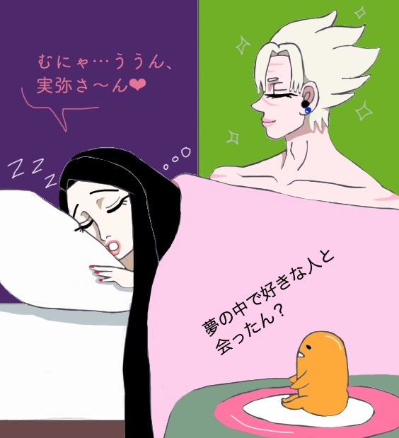 🍃さねねず(現パロ&コラボ)🎀 11月ワンドロお題「眠り」 夢の中に実弥ちゃんが出てきて、無意識に寝言を言う禰豆子ちゃん。その寝言をこっそりと聞いてるぐでちゃん🥚 #さねねずワンドロライ #鬼滅の刃お絵描き #絵描きさんと繋がたい