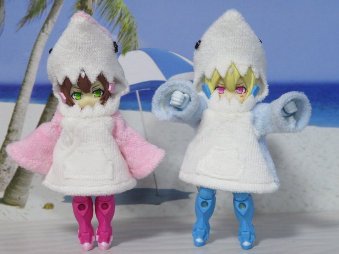 「やほ!」 夕暮れ時、ちょっぴり涼しくなったので浜辺へ🦈 流木で遊んだり、岩場を探検したり…… 風が強いから転ばされないように気をつけて! #デスクトップアーミー #さめパーカー #サメは良いぞ