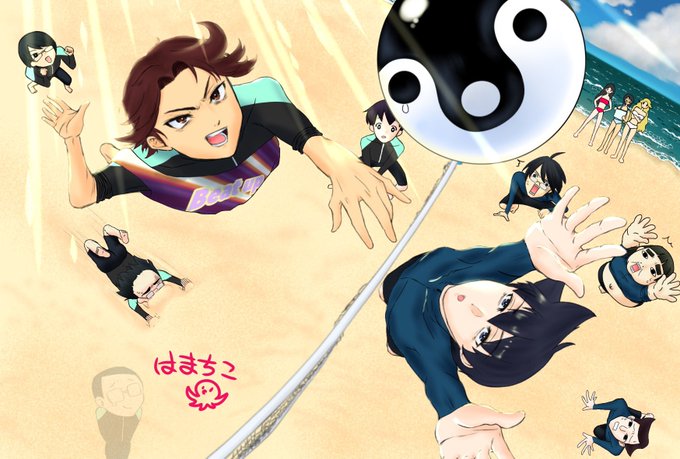 ごめーんもう間に合わないからあげー⤴︎︎︎⤴︎︎︎⤴︎︎︎✨ 3のへ男子対抗ビーチバレーの部!! みんなラッシュガード来てる中、木野くんだけはまたよく分からない服を着てます。 #久米田キャラ水泳大会 #さよなら絶望先生 #久米田康治ファンアート