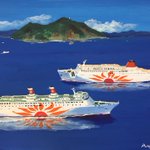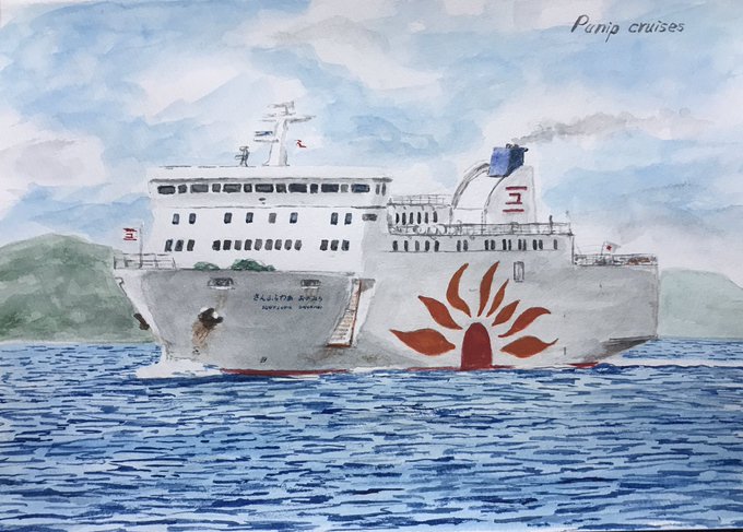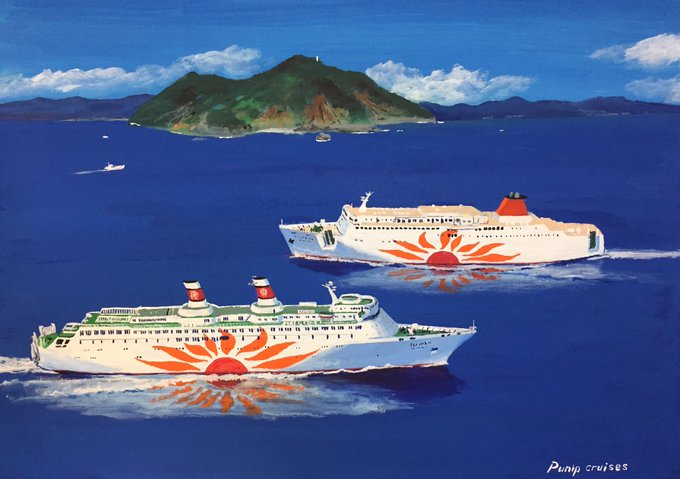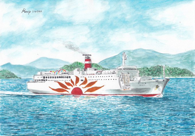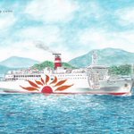 50年前の本日、名古屋~高知~鹿児島航路に就航した最初のさんふらわあ(船名に数字も地名も付きませんでしたが後年、ファンからは「ゼロ」と呼ばれていました) 高校生だった私はバイトで溜めたお金で就航翌年に名古屋~高知間に乗船しました。 絵は後年の関西汽船時代の姿です #さんふらわあ50th