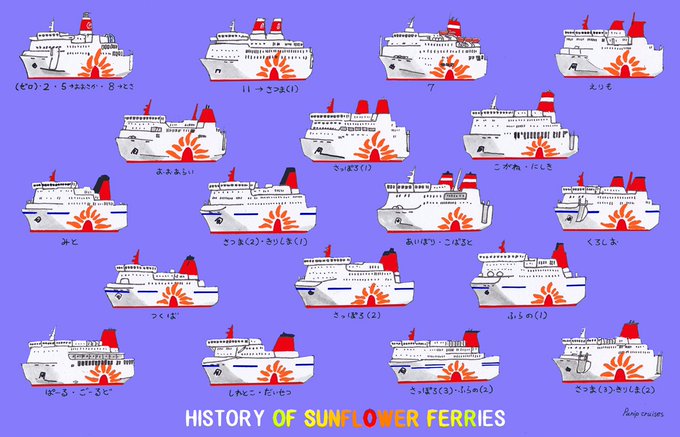 今日、2月1日はさんふらわあ誕生50周年! ということで過去の作品ですが、歴代さんふらわあの一覧です 但しRORO船は入っていませんm(__)m #さんふらわあ50th #商船三井フェリー #フェリーさんふらわあ #日本高速フェリー #ブルーハイウェイライン #関西汽船 #大洋フェリー #日本沿海フェリー