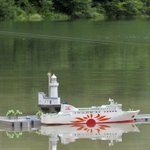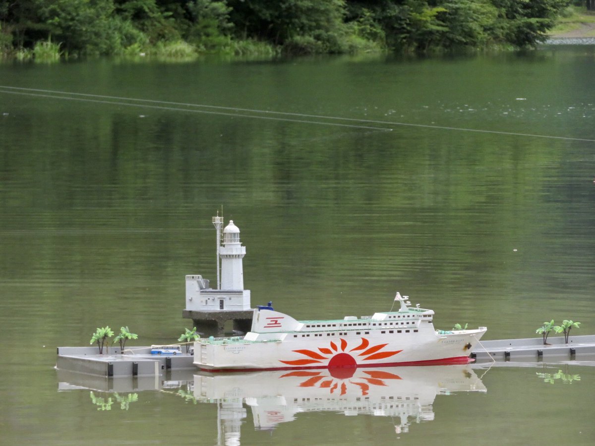さんふらわあ誕生50周年シリーズ 番外編 ないかい商船さん@sfonomichi の架空のRC船、さんふらわあ おのみちです 全長は70cmぐらい?…ご自宅のバスタブに浮かべられるサイズで建造されたそうです😅 絵の船首の社旗とファンネルの排煙が逆を向いていますが、今は修正済みです #さんふらわあ50th