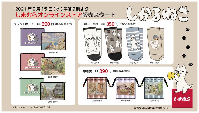\🎀しまむら限定アイテム🎀/ shop-shimamura.com しまむらオンラインストアにて、9/15(水)AM9時からポーチ・巾着袋・靴下が販売スタートだよ!チェックしてね🐾 #しかるねこ