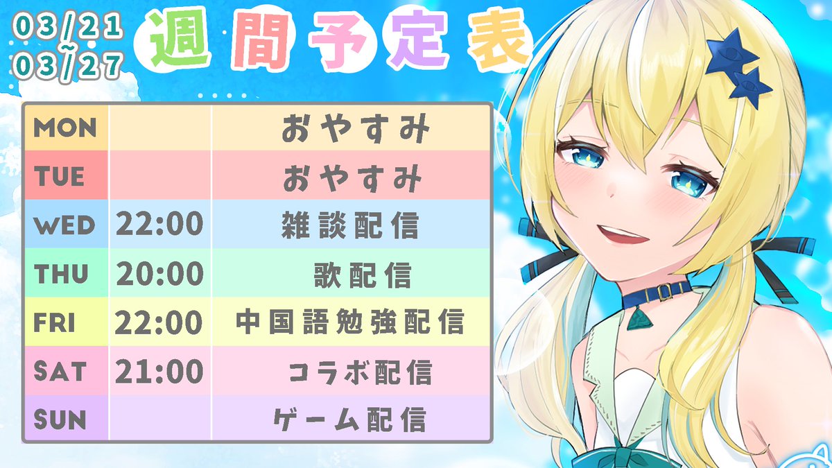 🐥配信スケジュール🐥 03月20日~03月26日配信スケジュール 🐥Youtube onl.bz/yhA8PWt 🐥FANBOX suzukazeshitora.fanbox.cc 🐥Skeb(ボイス依頼も募集中!) onl.bz/PzErZFt 🐥配信 #しとらいぶ 🐥イラスト #しとらーと ※使用させて頂くことがあります!