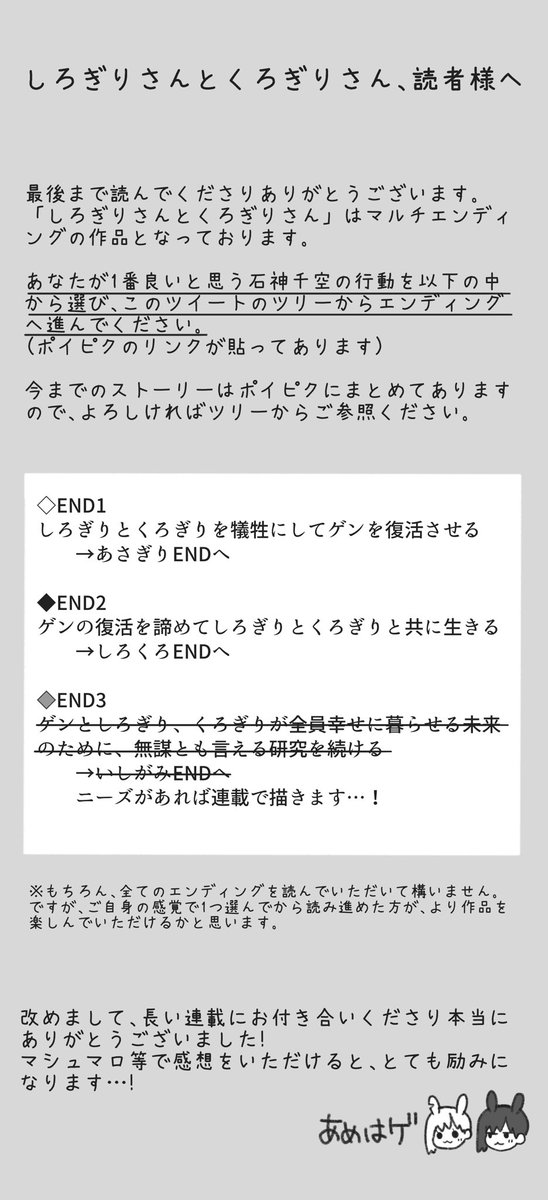 最終回更新の目処がたったので「#しろぎりさんとくろぎりさん」まとめました! 1週間以内に更新する予定ですので、読んでいただけたら嬉しいです☺️ しろくろぎり①〜❷⓪ poipiku.com/500755/5504377… しろくろぎり❷①〜❷④ poipiku.com/500755/5182474…