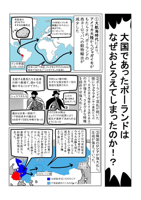 2月13日 マンガできました😆 「明治日本にも影響を与えたポーランド分割③」です! 大国だったポーランドはなぜおとろえたのか!? ※ブログで補足・解説をしています♪ syakaitteomosiroi.blogspot.com/2023/02/1795.h… #漫画 #漫画が読めるハッシュタグ #歴史 #ポーランド #世界史 #じゃがいも #シュラフタ