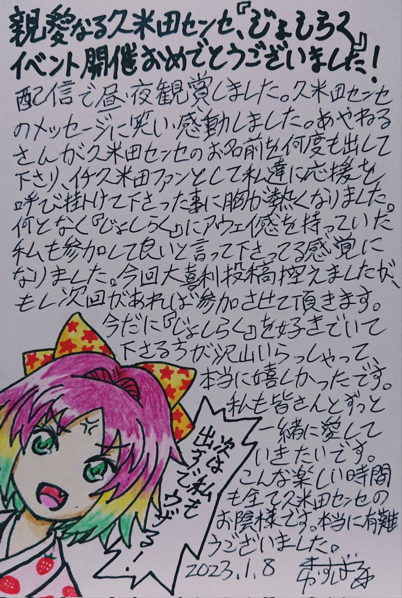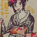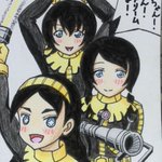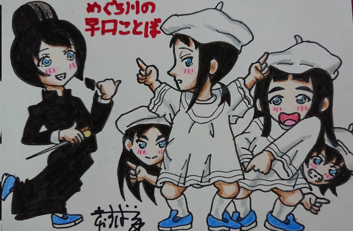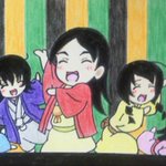 生「にゃんぱすー♪」をキメて下さった小岩井ことりさん風の波浪浮亭木胡桃さん、延々襲名記者会見の画像を使い回される南條愛乃さん風の空琉美遊亭丸京さん、イベントで誕生日ケーキをプレゼントされた後藤沙緒里さん風の暗落亭苦来さん。 #じょしらく #ミクアニ #久米田康治ファンアート