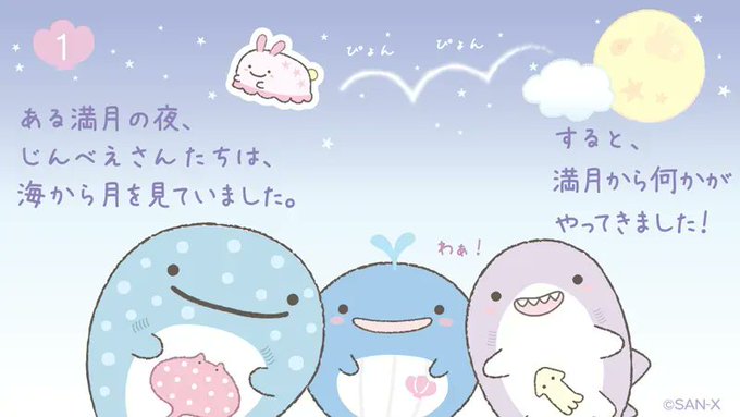 #じんべえさんとうみうさぎ ストーリー①🌕✨ ある満月の夜、じんべえさんたちは海から月を見ていました。すると、満月から何かがやってきました! 🐟グッズ情報はこちら🐰 san-x.co.jp/blog/goods/202…