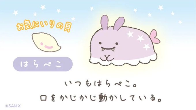 #じんべえさん のあたらしいお友だち 「うみうさぎ」紹介🐰③ ✨はらぺこ✨ いつもはらぺこ。口をかじかじ動かしている。キバがさめさんに似てる・・・?!🦈 #じんべえさんとうみうさぎ san-x.co.jp/jinbesan/campa…