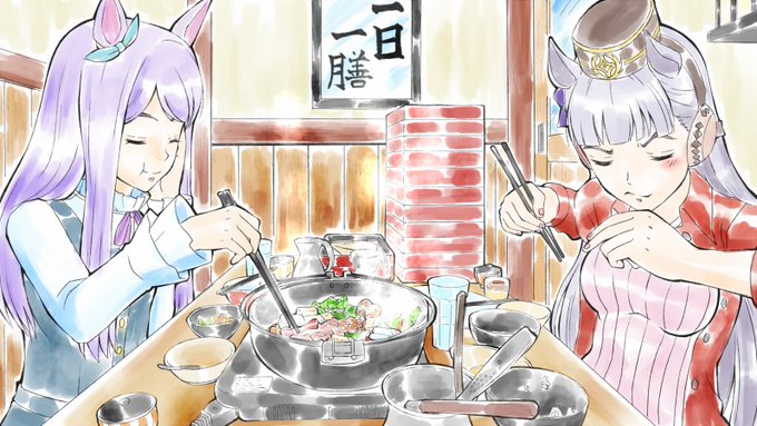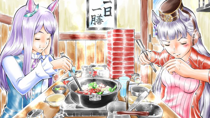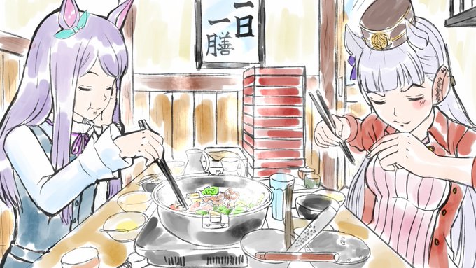 今日のお絵描き 完成 #ウマ娘 の 食事の時間 今回はすき焼きに挑戦してみたが汁の無い鍋物も中々勉強になりました。 #すき焼き #ウマ娘プリティダービー #イラスト #ゴールドシップ #メジロマックイーン #絵描きさんと繋がりたい #イラスト好きな人と繋がりたい