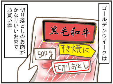 「今夜はすき焼き」(4コマ漫画) ゴールデンウイークは いつもよりいいお肉がスーパーに 並んでいるように思います。 そして狙うはその切り落とし😊 『鈴木さんちの4コマ漫画』 ブログ更新しました kimamas.com/post-6488/ #ゴールデンウィーク #漫画が読めるハッシュタグ #イラスト #すき焼き