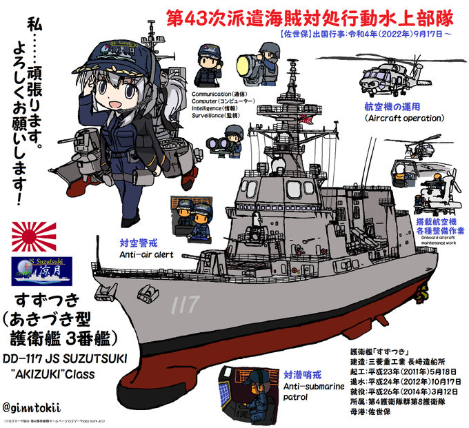 🎺おはようございます! 日曜日の朝です🌅 昨日、9月17日 #第43次派遣海賊対処行動水上部隊 #海上自衛隊 #護衛艦「#すずつき」の出国行事が 佐世保で行われたとの事 twitter.com/jmsdf_srh/stat… 日本近海にて14日間の訓練を実施した後 進出する予定との事 ご安航をお祈りします! 台風対策🔦🛠️万全に