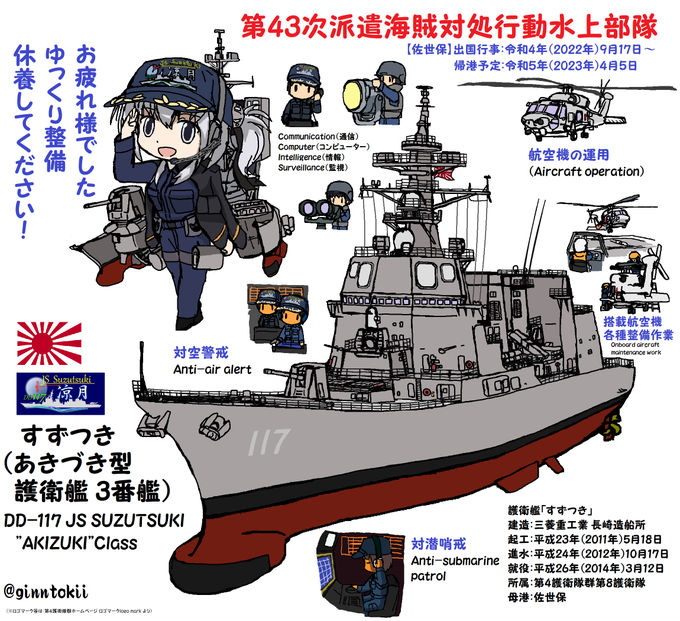 🎺おはようございます! 火曜日の朝です🌅 昨日 #海上自衛隊 第43次派遣海賊対処行動水上部隊 護衛艦「#すずつき」が 佐世保に帰ってきたようですtwitter.com/marbochin/stat… 沖に投錨しているので 予定の4月5日に帰港(式典等?)なのかも お疲れ様でした ゆっくり整備、休養してください! /( ̄▽ ̄)✨