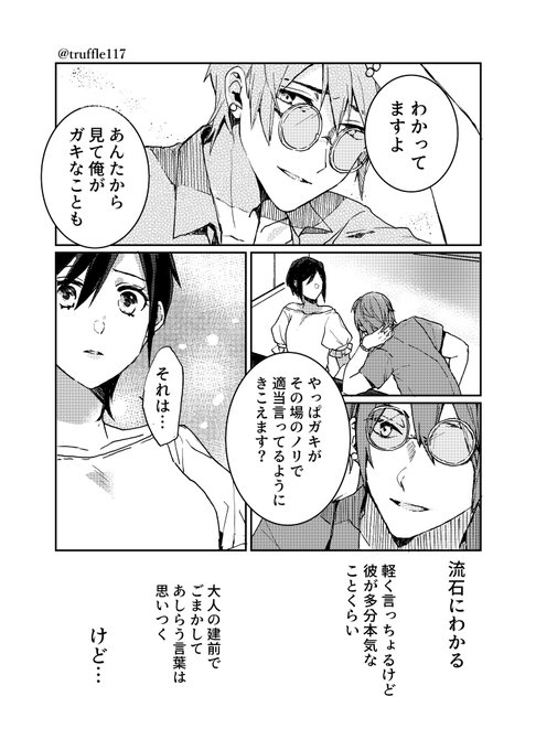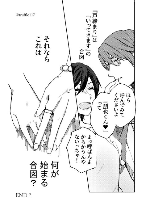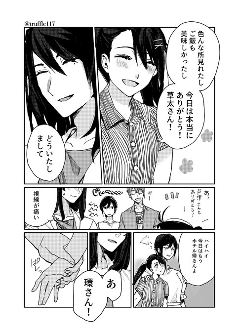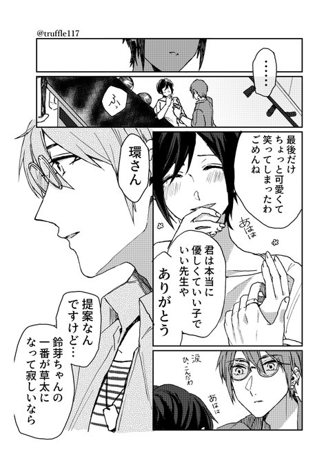 おまたせしました!芹環漫画全3回の3回目です。今まで書いたもの(漫画・小説)と地続きの話ですが、見てなくても多分大丈夫?よろしければば! 『幸せのかたち』【3話目】1/2 一番最初はこちら↓ twitter.com/truffle117/sta… #すずめの戸締まりFA #芹澤朋也