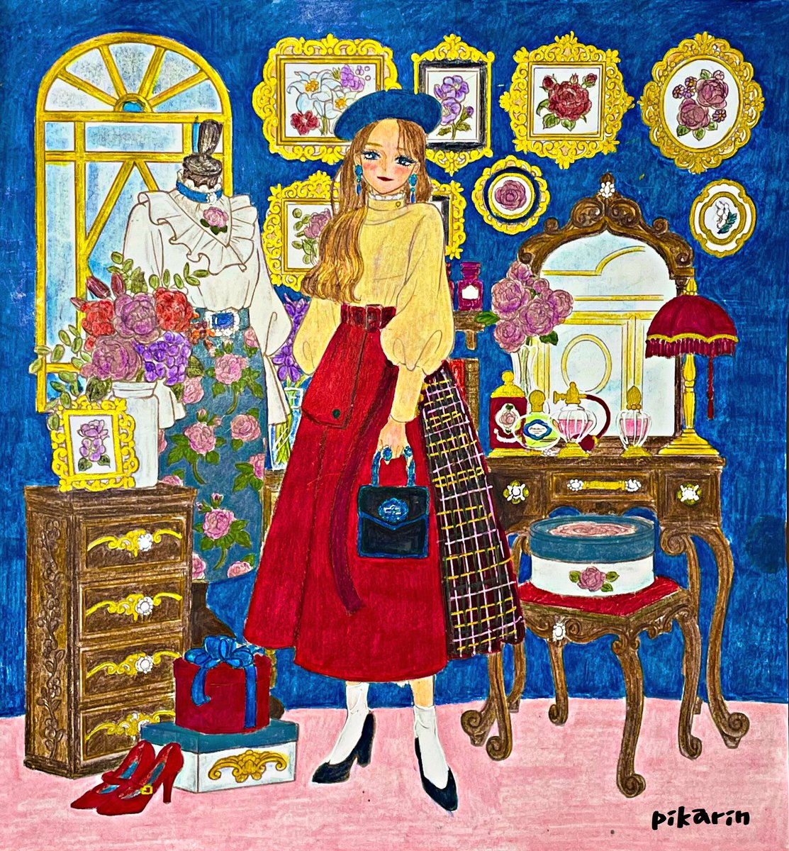 @surume050505 #すずらん通りの洋服店ぬり絵BOOK #すずらん通りの洋服店 #大人の塗り絵 #色鉛筆 #prismacolor #polychromos #アルコールマーカー どのページも可愛いかったけど、めっちゃ細かくて!自分の色のセンスの限界を実感させられた本でした💦センス落ちてないかな〜(*´艸`)