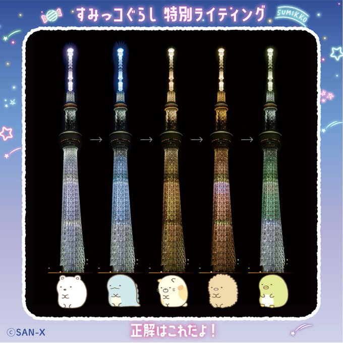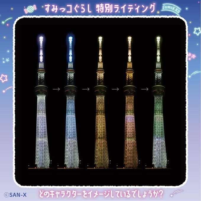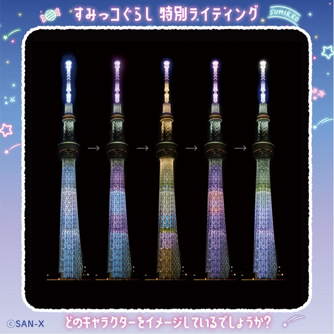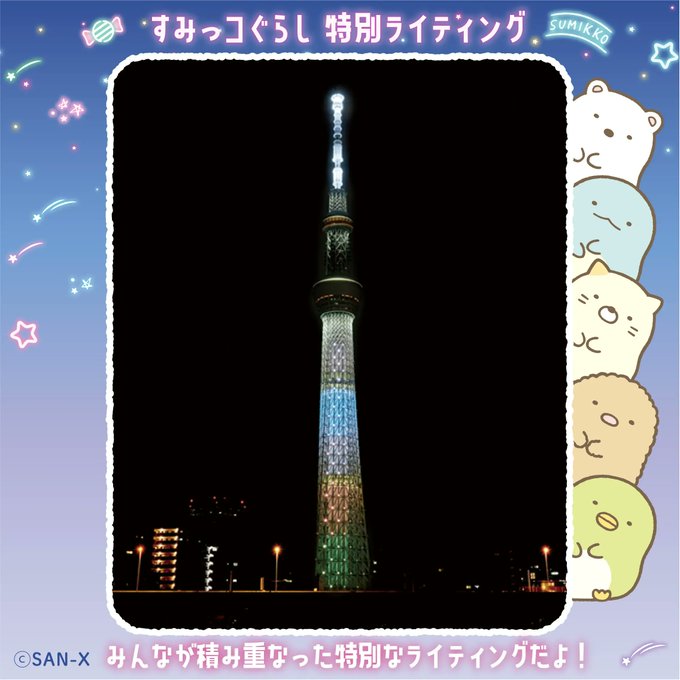 東京スカイツリー®特別ライティング✨ 本日~8月14日まで毎日、 8月20日以降は毎週土曜日に点灯! 5段に積み重なったすみっコたちをイメージしたライティングの他、キャラクターごとのライティングもあります♪ #すみっコぐらし10周年